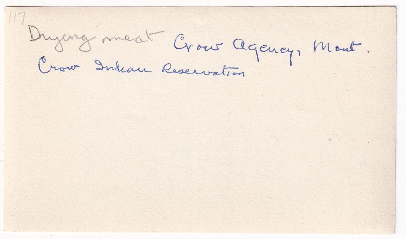 Title on Back: Drying Meat Crow Agency Montana, Crow Indian Reservation. 2 1/2" by 4 1/4". Provenance: Aline Natalie Burgess Claremont Los Angeles, daughter of James Gregor Burgess builder of the Burgess Baptist Church Crow Agency Montana, through Decent.