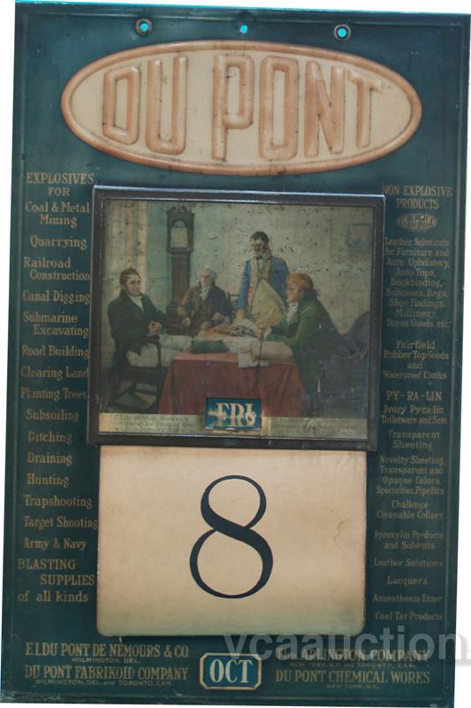 DuPont Advertising Perpetual Calendar Embossed Metal & depicting all products made by DuPont All Calendar Cards are there, Fair Condition 19" x 29"