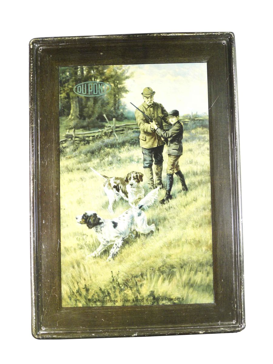 DuPont Powder Company Self Framed Tin Sign. Edm. H. Osthaus, artist. Scratches mostly around the perimeter, appears to have been over coated, otherwise good condition. 23 X 33 inches.