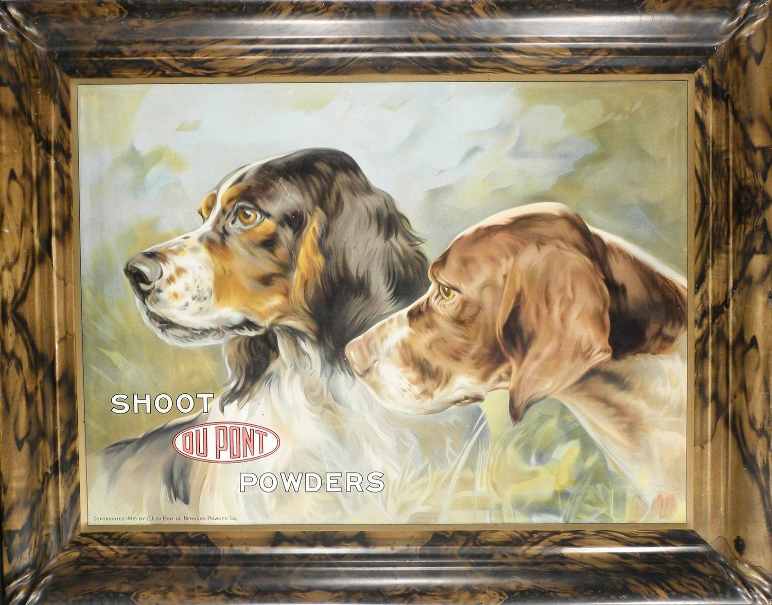 DuPont Self Framed Tin Sign. Hunting dogs, Wm. H. Osthous, artist. Copyright 1903 by E.I. du Pont de Nemours Powders Co. Near mint condition. 28 1/4 X 22 1/4 inches.