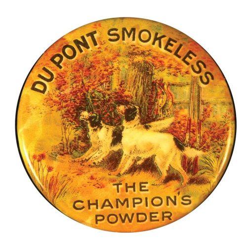 Celluloid Pinback advertising DuPont Smokeless Gun Powder. 1 1/4 inch diameter.