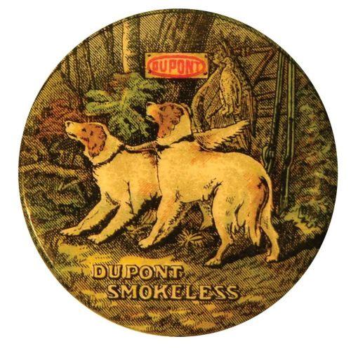 Celluloid Pinback advertising DuPont Smokeless Gunpowder, depicting two dogs. Excellent condition. 1 inch diameter.