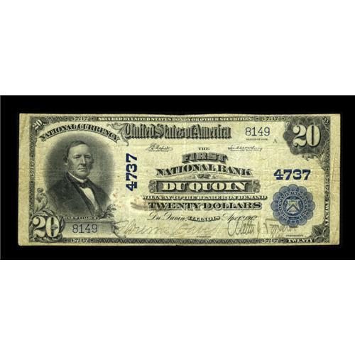 <B>DuQuoin, IL</B></I> - $20 1902 Plain Back Fr. 654 <B>The First NB</B></I> Ch. # 4737<BR>While two dozen Series 1929 examples are known from this one bank community, large examples are quite scarce, with the census showing only four such notes extant from here. This is one of that small group, having been sold by us back in January of 2002. <B>Fine,</B></I> with pen signatures.<BR><I>From The Lincoln Collection</B></I><BR><BR><b>Shipping:</b> Coins & Currency (<a target="_blank" href="http://www.heritageauctions.com/common/shipping.php">view shipping information</a>)