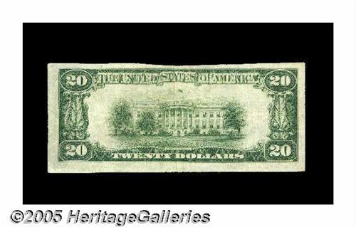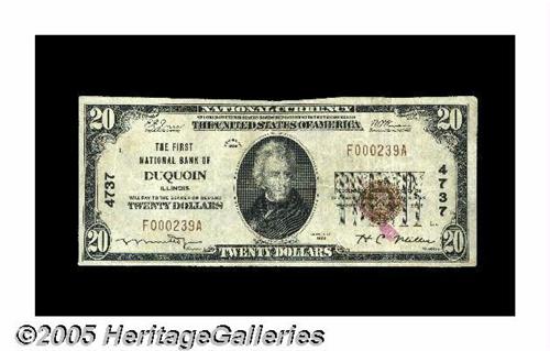 <B>DuQuoin, IL</B></I> - $20 1929 Ty. 1 <B>The First NB</B></I> Ch. # 4737<BR>When this institution failed in 1935 the community was left without a federally chartered thrift institution. The <B>Very Fine</B></I> example we offer tonight has hints of an old bank stamp at right, but is overall quite attractive.
