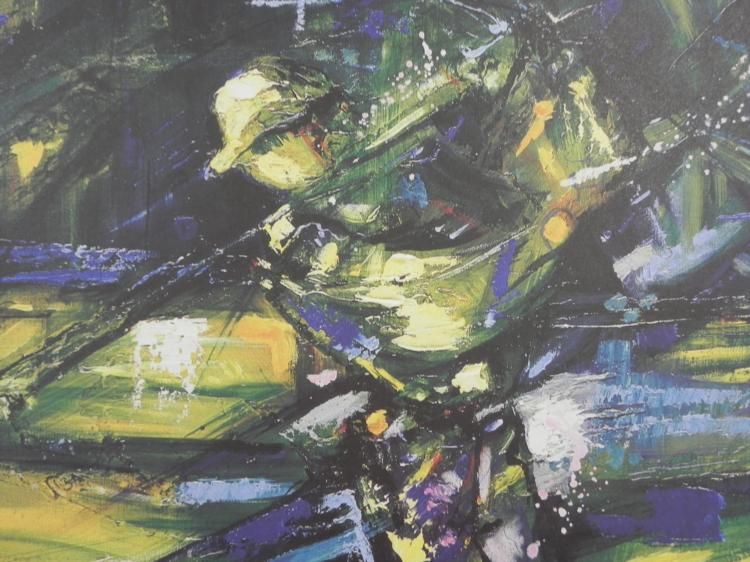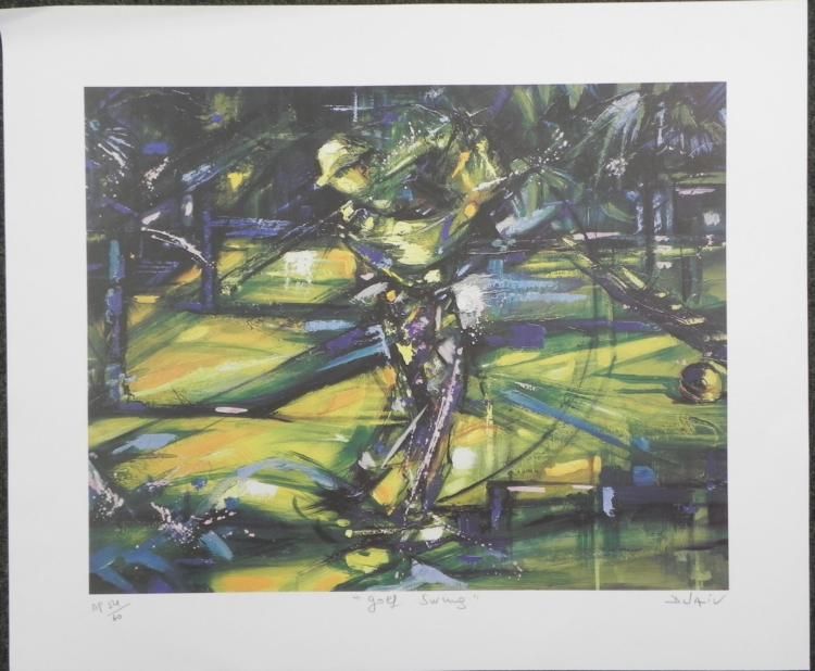 Artist: DuaivTitle: Golf Swing * Medium: Litho print on * paperSignature: Signed by artist, lower * rightEdition: Aritst proof numbered out of 60, lower * leftImage size: 24" x * 19" * Sheet size: 25" x * 30" * Condition: Very good; minor fold to upper left corner that can be matted out * Biography: * * * * * * * Jean-Marie * Duaiv was born in 1952. At the age of 9, and with his left hand, he * painted his first oil. Luckily for him, his parents did not block his * artistic vocation. To some extent it can be said that his parents * diversified his vocation by enrolling him in both the Conservatory of * Music and the School of Fine Art in Paris. * * Luminous, * extremely bright, they are alive, lively contrasting colors reveal * tumultuous vitality. All of these can be said of Duaiv's artwork. An * exceptionally talented artist, Duaiv eludes classical approaches. The * colors he uses are just like the Grasse flower festival. There are * greens, pinks, yellow and flowers even when he puts Paris to sleep on * the canvas. * * *Retrieved from: * http://www.mastersgallerydenver.com/Biographies/duaiv.html * *