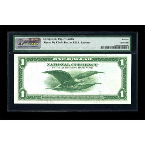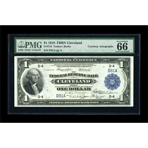 <B>Dual Courtesy Autographed Fr. 718 $1 1918 Federal Reserve Bank Note PMG Gem Uncirculated 66 EPQ.</B></I> Edwin Baxter and E.R. Fancher autographed this lovely serial number 81 note above their engaved signatures. We have serial numbers 81-84 of both the $1 and $2 FRBN denominations on Cleveland with autographs of Baxter and Fancher in this auction. <BR><BR><b>Shipping:</b> Coins & Currency (<a target="_blank" href="http://www.heritageauctions.com/common/shipping.php">view shipping information</a>)