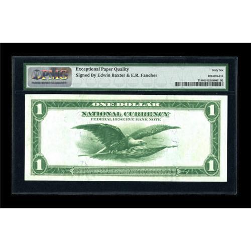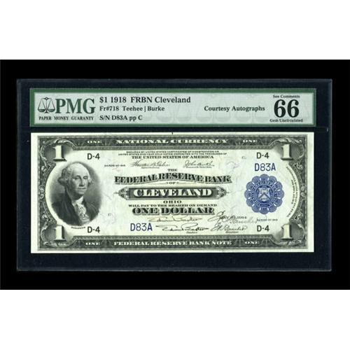 <B>Dual Courtesy Autographed Fr. 718 $1 1918 Federal Reserve Bank Note PMG Gem Uncirculated 66 EPQ.</B></I> This boldly embossed serial number 83 note has the autographs of Baxter and Fancher above their engraved signatures.<BR><BR><b>Shipping:</b> Coins & Currency (<a target="_blank" href="http://www.heritageauctions.com/common/shipping.php">view shipping information</a>)