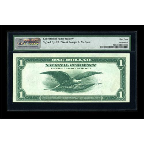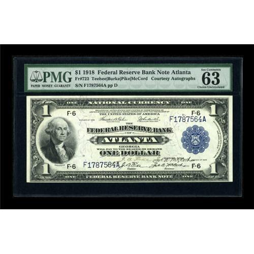 <B>Dual Courtesy Autographed Fr. 723 $1 1918 Federal Reserve Bank Note PMG Choice Uncirculated 63 EPQ.</B></I> J.B. Pike and Jos. A. McCord autographed this strongly embossed note above their engraved signatures. According to the census this pair of officers autographed just one other note of this Friedberg number. <BR><BR><b>Shipping:</b> Coins & Currency (<a target="_blank" href="http://www.heritageauctions.com/common/shipping.php">view shipping information</a>)