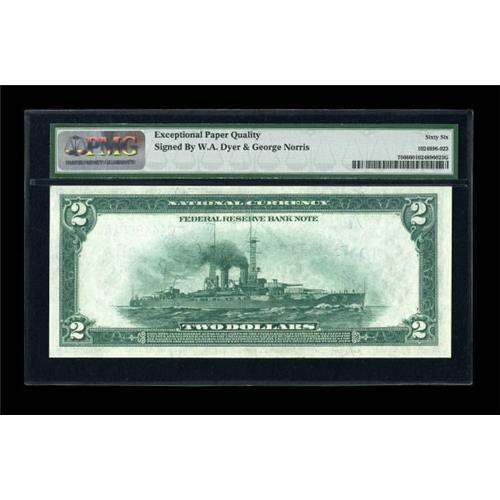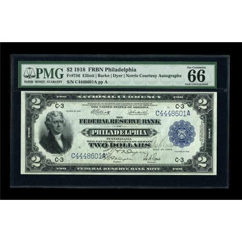 <B>Dual Courtesy Autographed Fr. 756 $2 1918 Federal Reserve Bank Note PMG Gem Uncirculated 66 EPQ.</B></I> This well preserved Battleship has been autographed by W.A. Dyer and George Norris above their signatures. There are only three Dyer-Norris autographed notes in the census for this Friedberg number and this is one of them.<BR><BR><b>Shipping:</b> Coins & Currency (<a target="_blank" href="http://www.heritageauctions.com/common/shipping.php">view shipping information</a>)