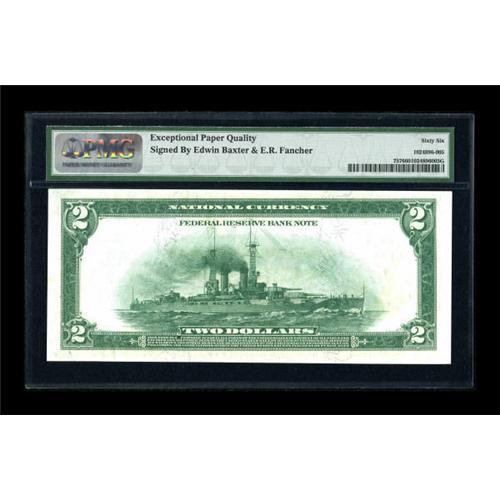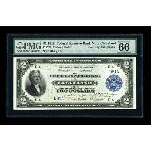 <B>Dual Courtesy Autographed Fr. 757 $2 1918 Federal Reserve Bank Note PMG Gem Uncirculated 66 EPQ.</B></I> One long-ago collector got both Baxter and Fancher to autograph the Cleveland low serial number notes in this auction. There are a total of nine Baxter-Fancher autographed notes in the census for this Friedberg number, but the four autographed notes of this officer combination we have in this auction is the only complete cut sheet recorded. This beautiful Battleship with serial number 81 displays embossing. Do not forget that we have serial numbers 81-84 of both the $1 and $2 FRBN denominations on Cleveland with autographs of Baxter and Fancher in this auction.<BR><BR><b>Shipping:</b> Coins & Currency (<a target="_blank" href="http://www.heritageauctions.com/common/shipping.php">view shipping information</a>)