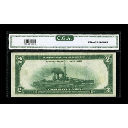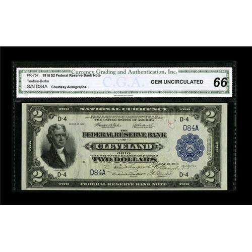 <B>Dual Courtesy Autographed Fr. 757 $2 1918 Federal Reserve Bank Note CGA Gem Uncirculated 66.</B></I> This is a well preserved example that has strong embossing of its two-digit serial number of D84A. It also has signatures of both Baxter and Fancher that are near the size of their engraved counterparts.<BR><BR><b>Shipping:</b> Coins & Currency (<a target="_blank" href="http://www.heritageauctions.com/common/shipping.php">view shipping information</a>)
