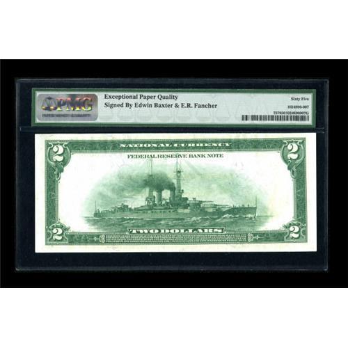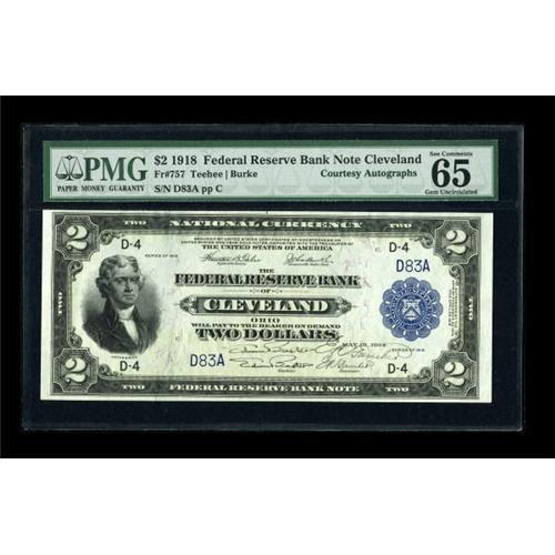 <B>Dual Courtesy Autographed Fr. 757 $2 1918 Federal Reserve Bank Note PMG Gem Uncirculated 65 EPQ.</B></I> Prominent embossing and natural paper wave adorn this Deuce with serial number D83A and autographs of both Baxter and Fancher. <BR><BR><b>Shipping:</b> Coins & Currency (<a target="_blank" href="http://www.heritageauctions.com/common/shipping.php">view shipping information</a>)