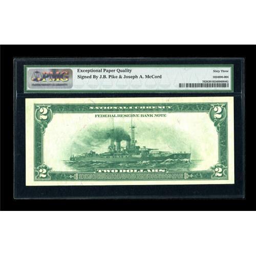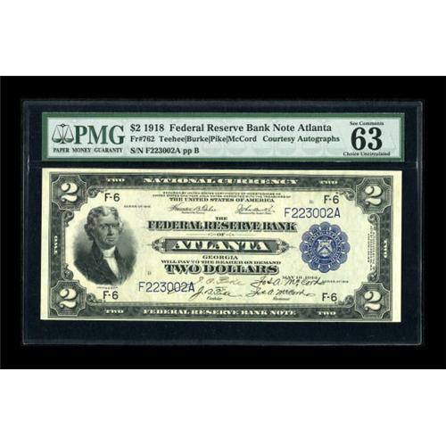 <B>Dual Courtesy Autographed Fr. 762 $2 1918 Federal Reserve Bank Note PMG Choice Uncirculated 63 EPQ.</B></I> This embossed note carries the autographs of J.B. Pike and Jos. A. McCord. This pair of officers signed just one other note of this Friedberg number according to the census.<BR><BR><b>Shipping:</b> Coins & Currency (<a target="_blank" href="http://www.heritageauctions.com/common/shipping.php">view shipping information</a>)