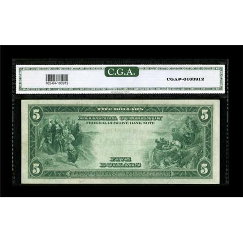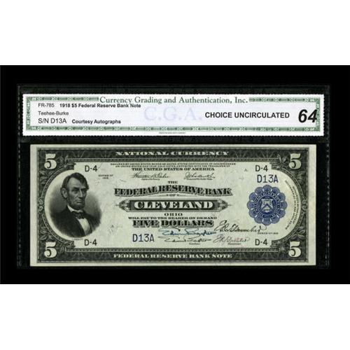 <B>Dual Courtesy Autographed Fr. 785 $5 1918 Federal Reserve Bank Note CGA Choice Uncirculated 64.</B></I> Edwin Baxter and E.R. Fancher autographed this serial number D13A note above their engraved signatures. This is the lowest serial number of six recorded autograph notes with this pair of officers for this Friedberg number.<BR><BR><b>Shipping:</b> Coins & Currency (<a target="_blank" href="http://www.heritageauctions.com/common/shipping.php">view shipping information</a>)