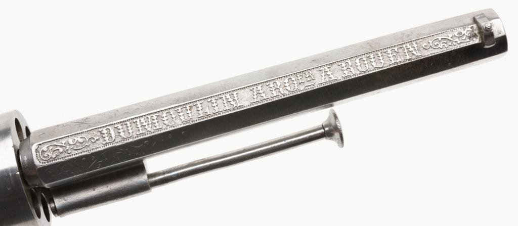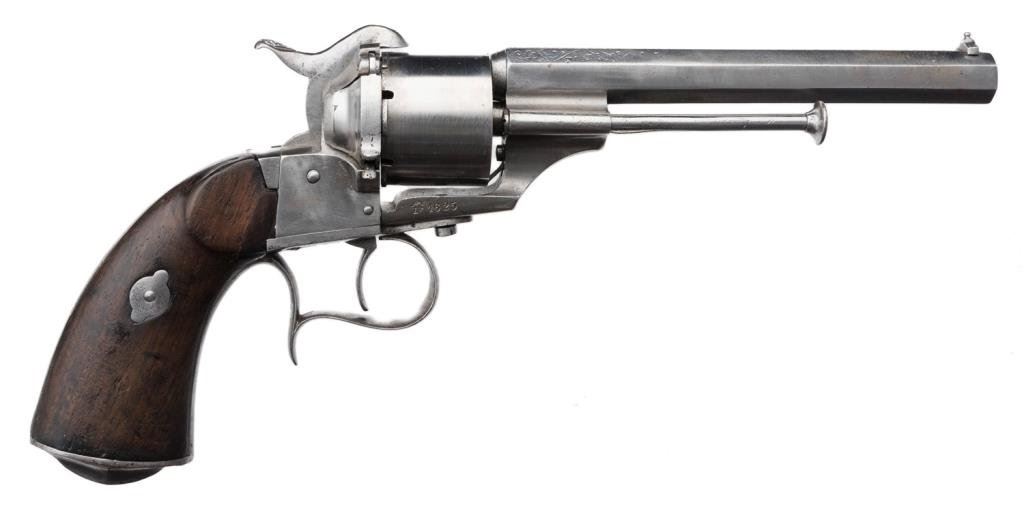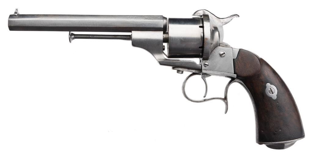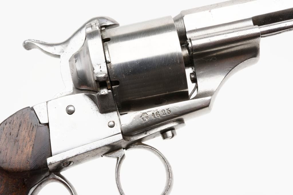 Dual Ignition (pinfire and center fire) revolver of military style, 9mm caliber, 6” octagon barrel with maker signature “DUMOULIN/ARQER/A/ROUEN”, S/N 1625, wood grips, cleaned finish, tight action; good overall. Est.: $800-$1,600.