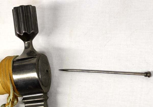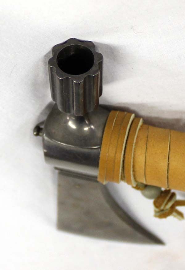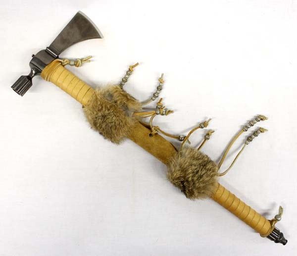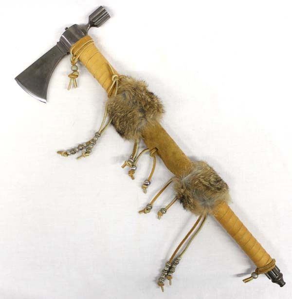 Dual Metal Hatchet Peace Pipe, leather wrapped handle, embellished with rabbit fur, metal beads and pony beads, well executed