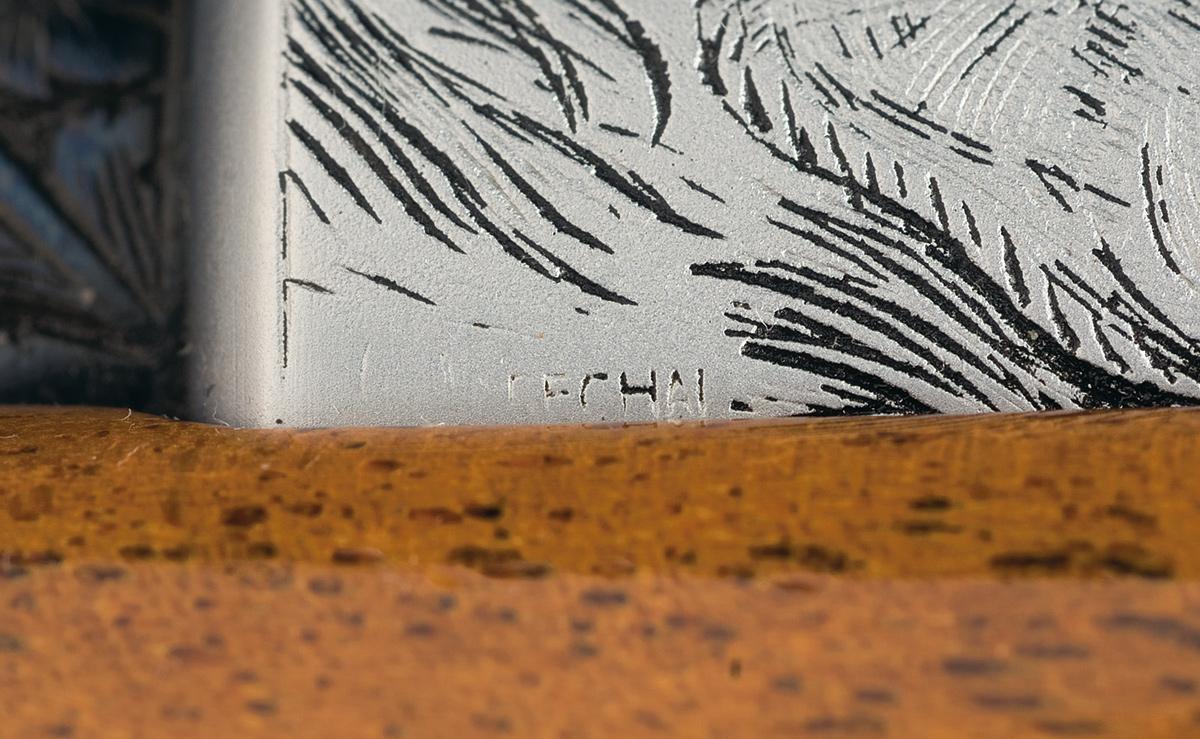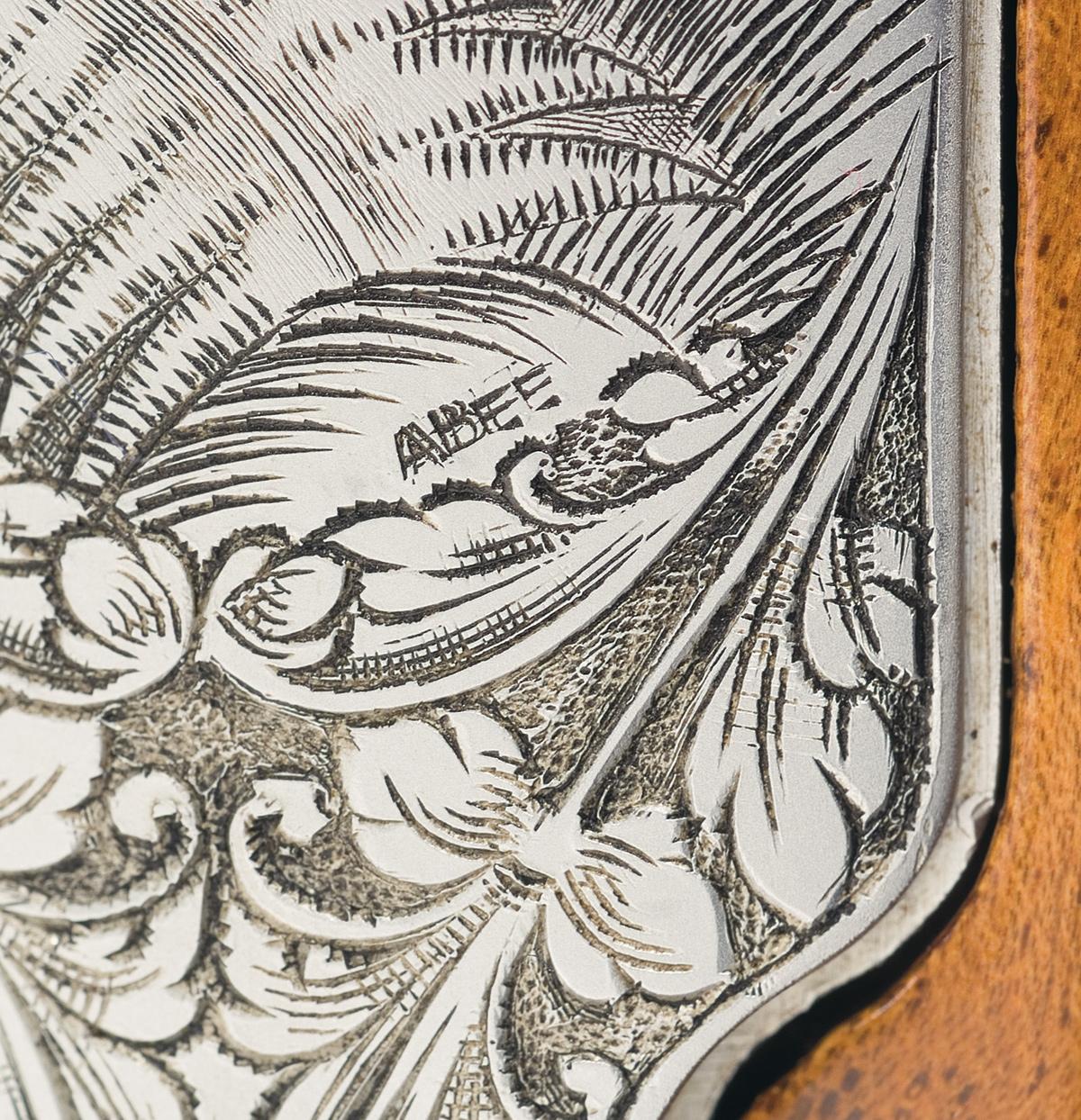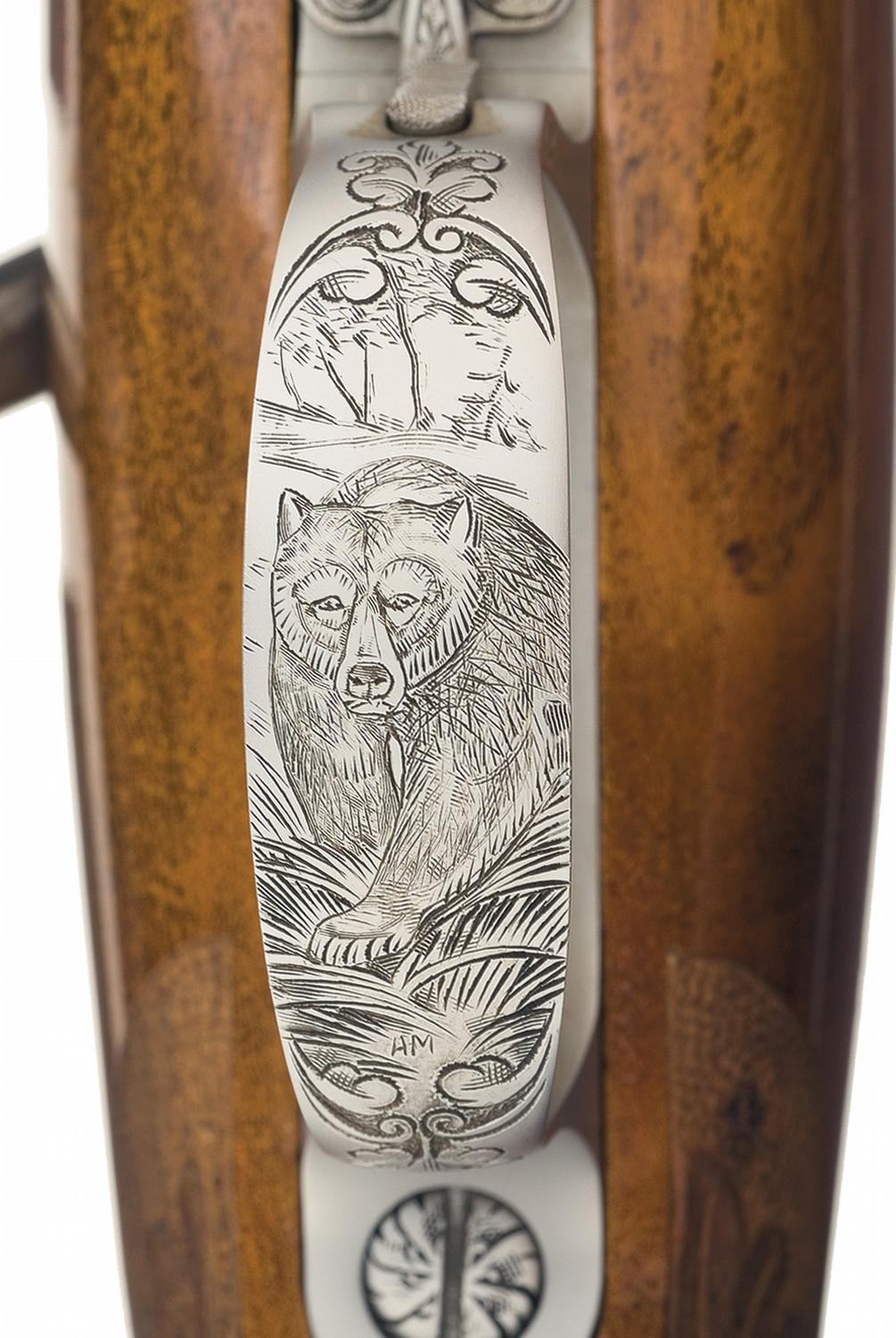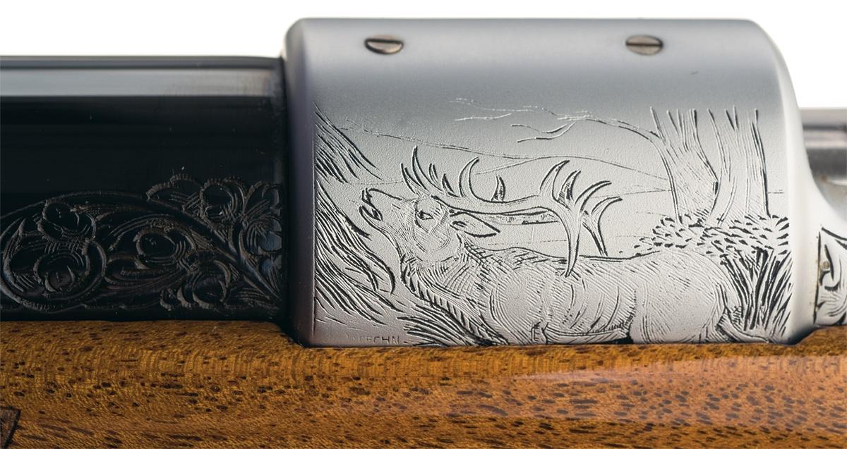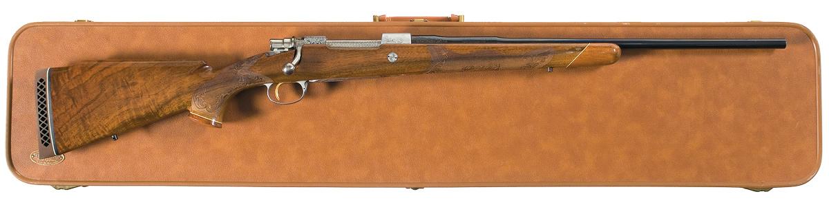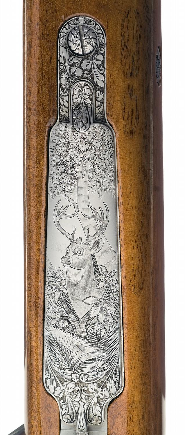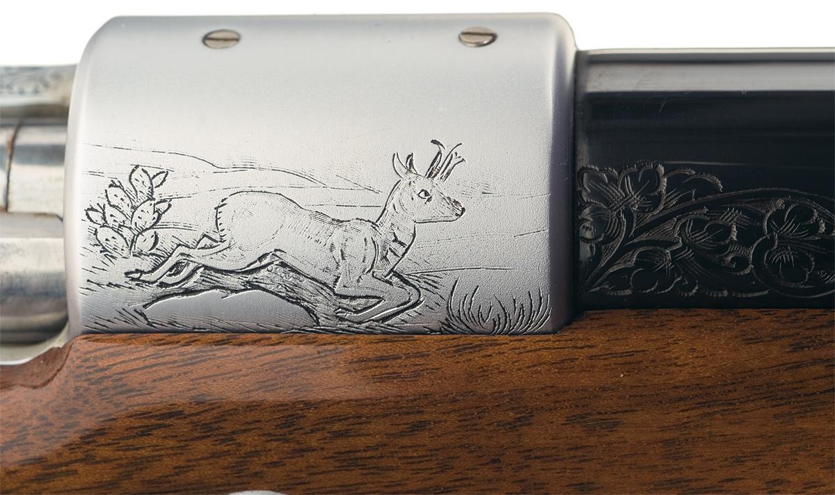 Manufactured in Belgium in 1978, this rifle features a blue barrel manufactured without sights and French grey finish on the remaining parts. The top of the receiver has been factory drilled and tapped for scope mounting. The follower and bolt are polished with a desirable long jeweled extractor, and the trigger is gold washed. The front receiver ring is engraved with a bugling elk on the left side, a running pronghorn antelope on the right side and the remainder of the action is scroll leaf and punch dot engraved. The left side of the receiver is signed "A MARECHAL". The hinged floor plate engraved with a deer in a wooded scene with floral scroll engraving below and on the attaching metal. The trigger guard is engraved with a bear. The floor plate is signed "ABEE" and the trigger guard is signed with the initials "AM" There is a two inch wedge of floral leaf engraving on each side of the breech end of the barrel. The screw heads and stock bolts are also engraved with floral designs. The stock is extra fancy select walnut with a high gloss finish, fine line checkering and floral and punch dot hand carving on the forearm and grip area, contrasting forend and grip cap with a diamond shaped brass inset on the grip cap, raised comb, cheekpiece, rubber vented Browning recoil pad and sling swivel studs. Complete with a Browning hard case.