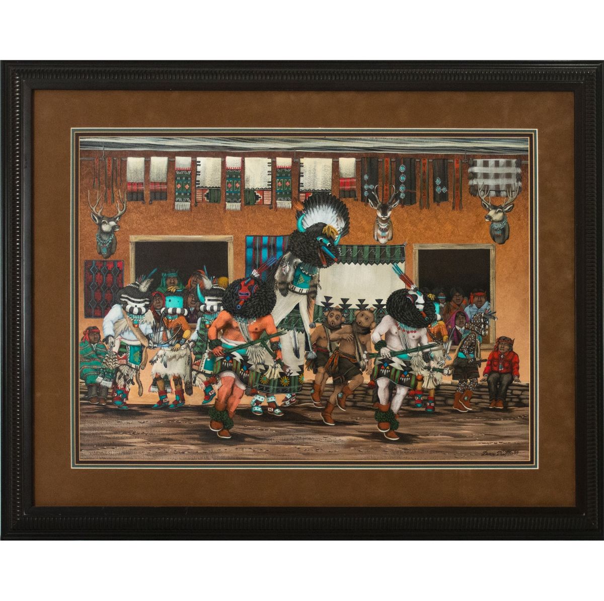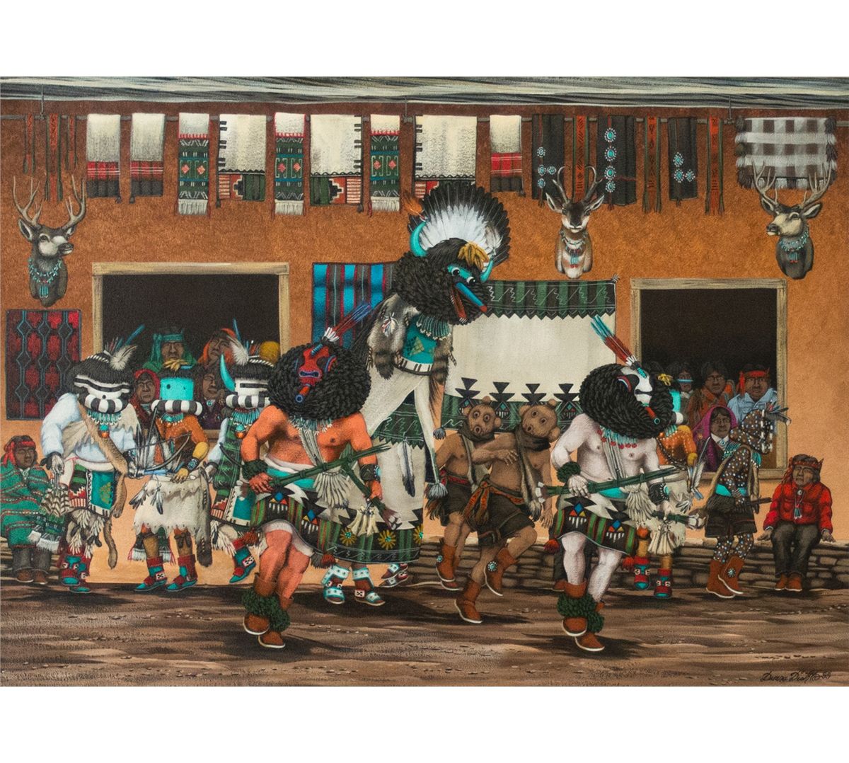 Duane Dishta (1946 - 2011). Plaza Dance. 18" x 25" oil on canvas. Signed lower right: Duane Dishta 99. Provenance: Indian River Gallery.