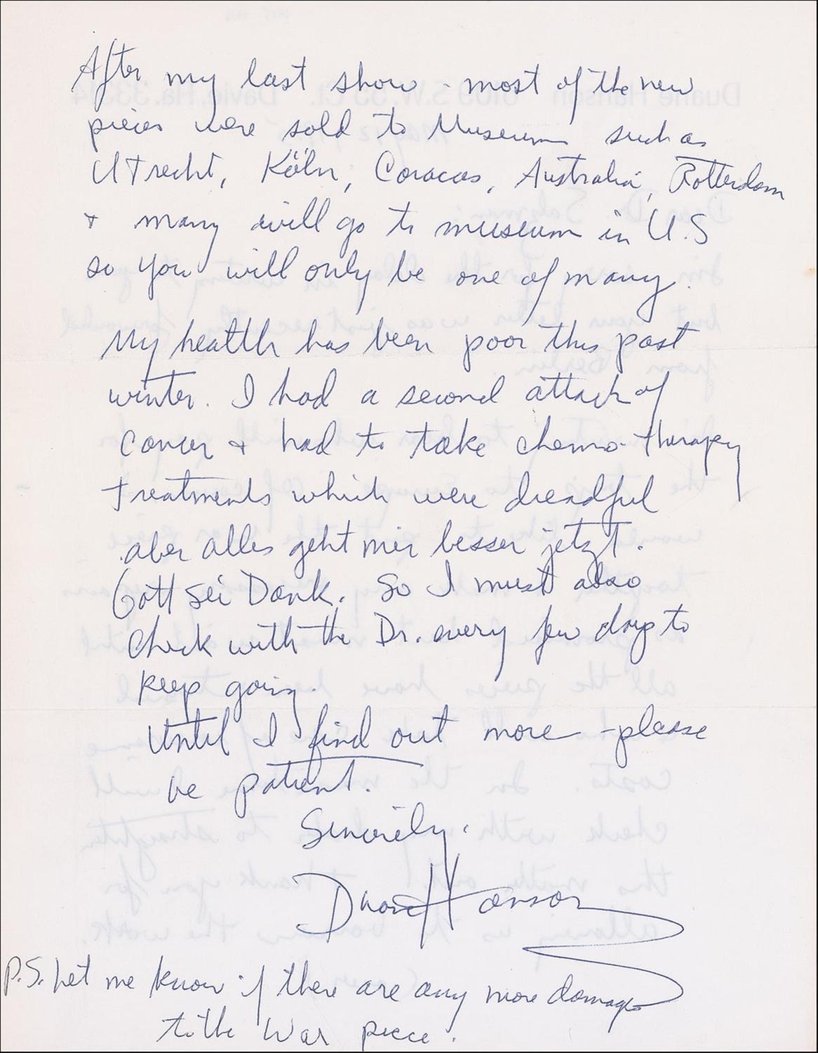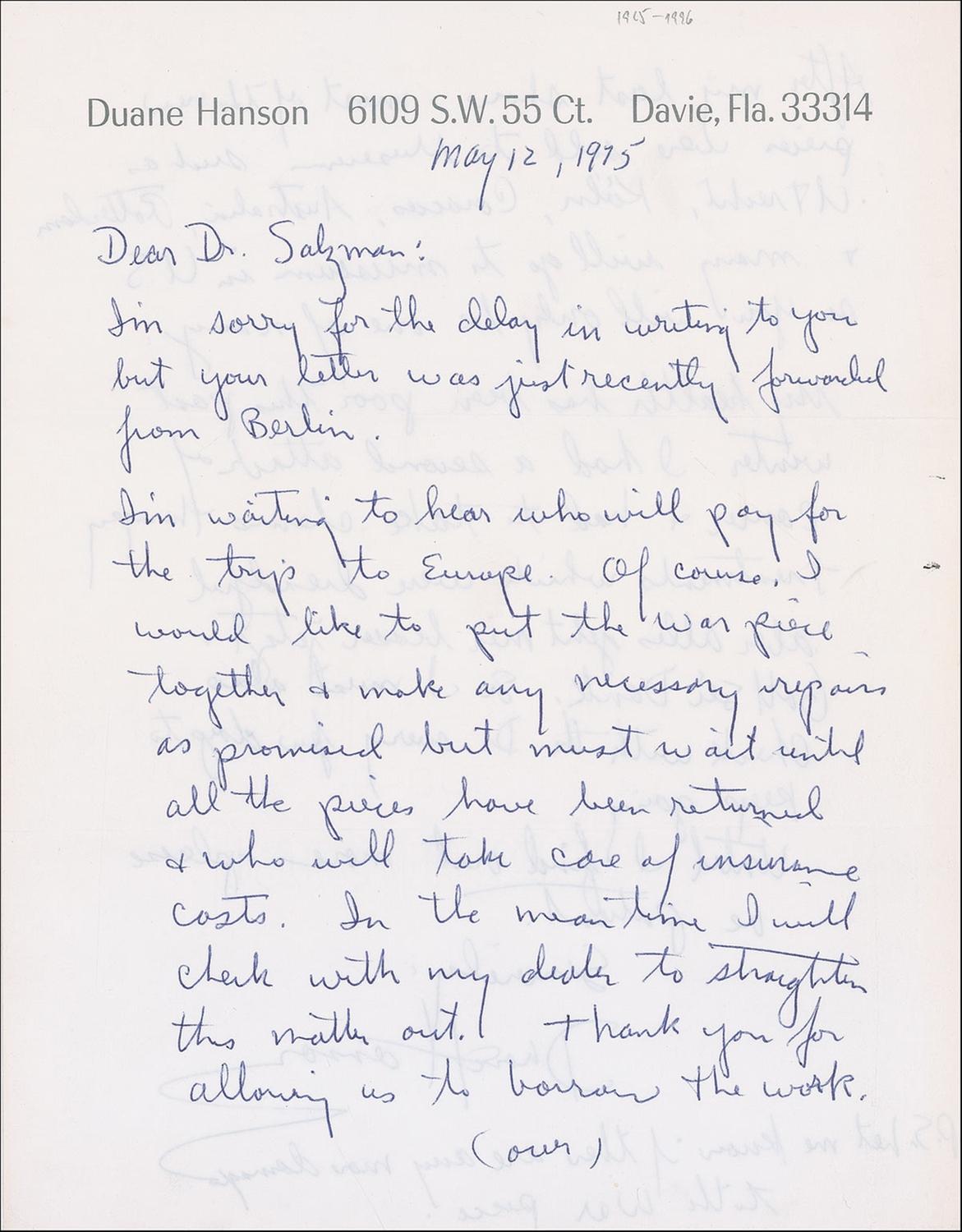 Well-regarded American artist (1925–1996) best known for his highly precise, lifelike sculptures of ‘ordinary’ folk doing ordinary things. ALS, one page both sides, 8.5 x 11, personal letterhead, May 12, 1975. Letter to Siegfried Salzmann. In part: “I’m sorry for the delay in writing to you…I’m waiting to hear who will pay for the trips to Europe. Of course, I would like to put the War piece together & make any necessary repairs as promised but must wait until all the pieces have been returned & who will take care of insurance costs. In the meantime I will check with my dealer to straighten this matter out. Thank you for allowing us to borrow the work. After my last show–most of the new pieces were sold to museums such as Utrecht, Köln, Caracas, Australia, Rotterdam & many will go to museum in U.S. so you will only be one of many. My health has been poor this past winter. I had a second attack of cancer & had to take chemo-therapy treatments which were dreadful aber alles geht mir besser jetzt. Gott sei Dank. So I must also check with the Dr. every few days to keep going.” Hanson writes in his brief postscript: “Let me know if there are any more damages to the War piece.” In fine condition, with expected horizontal mailing folds, with an extra vertical fold to right side. Hanson is scarce in letters, particularly mentioning his works.