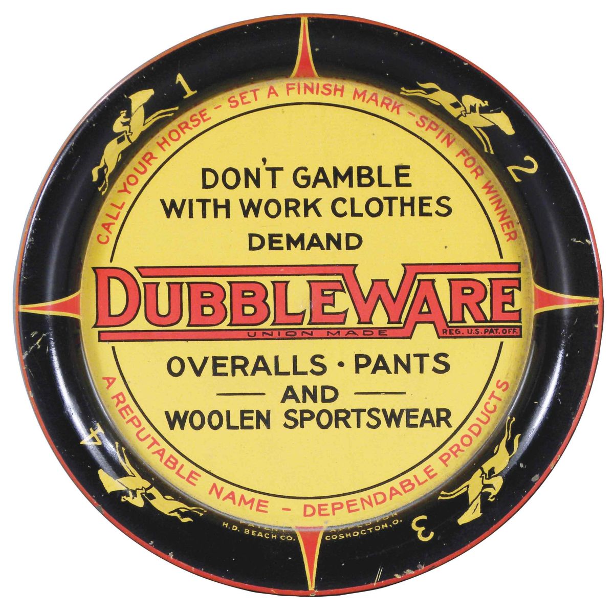 Dubbleware Overalls Pants and Sportswear Tin Tip Tray / spinner. Excellent condition. 4 1/8 inch diameter. Start Price $30