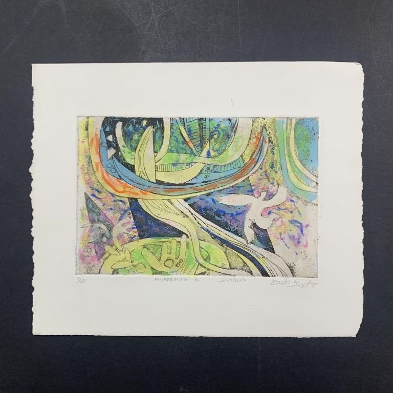 Dubi Arie's "Awakening B" limited edition print, signed and numbered 7/125 lower left. This piece is of a man dancing, in an abstract setting. This has been done in Arie's signature colourful style. This piece is in excellent condition.