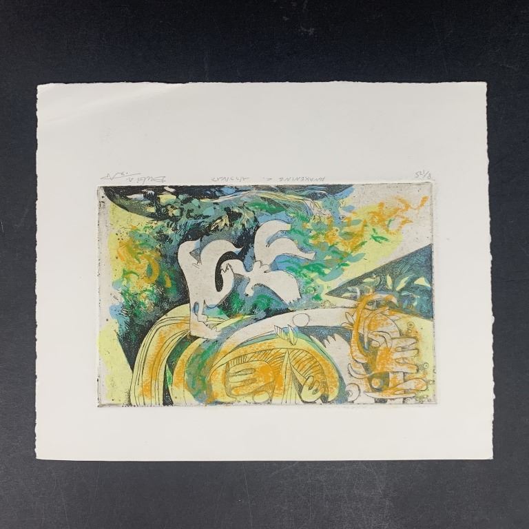 Dubi Arie's "Awakening" limited edition print, signed and numbered 8/125 lower left. This piece is of a couple holding hands, flying through the air. This has been done in Arie's signature colourful style. This piece is in very good to excellent condition with a very minor wrinkle lower right.