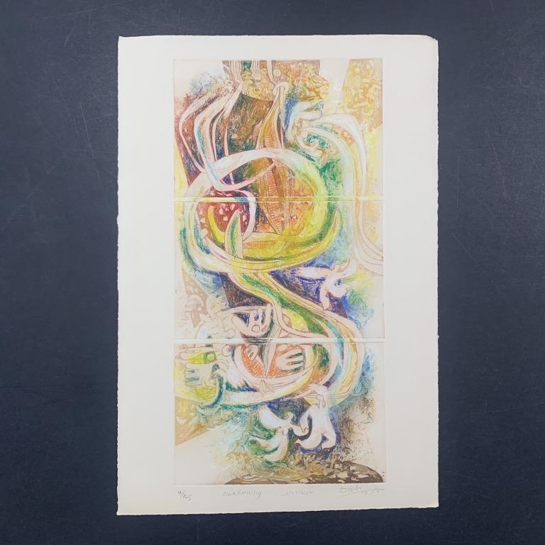 Dubi Arie's "Awakening" limited edition print, signed and numbered 4/125 lower left. This piece is of a couple holding hands, flying through the air. This has been done in Arie's signature colourful style. This piece is in excellent condition with extremely minor wrinkles lower right corner.