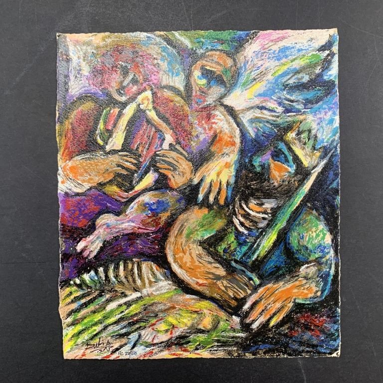 Dubi Arie's "Jealousy" limited edition print, signed and numbered 29/50 HC lower left. This piece is of a king and queen, with her playing a harp, and an angel in the middle. This has been done in Arie's signature colourful style, and has been signed and titled on reverse. This piece is in excellent condition.