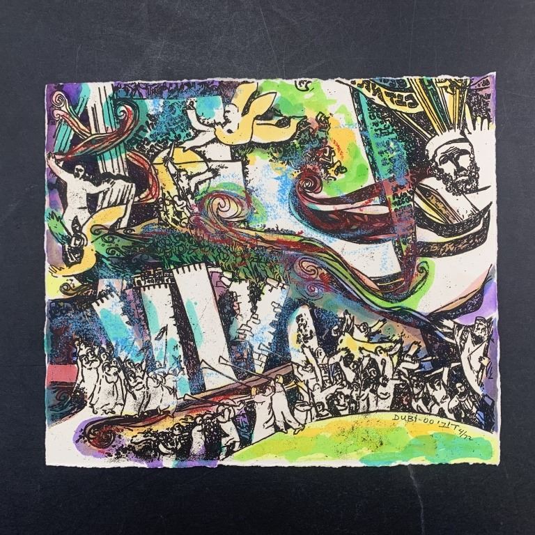 Dubi Arie's "Jericho" limited edition print, signed and numbered 4/72 lower right. This piece is of people at the bottom of a castle, blowing horns and having their arms raised. This has been done in Arie's signature colourful style, and has been titled and numbered on reverse. This piece is in excellent condition.
