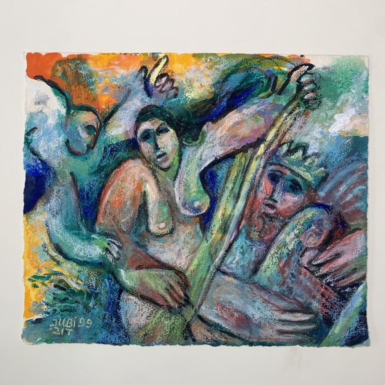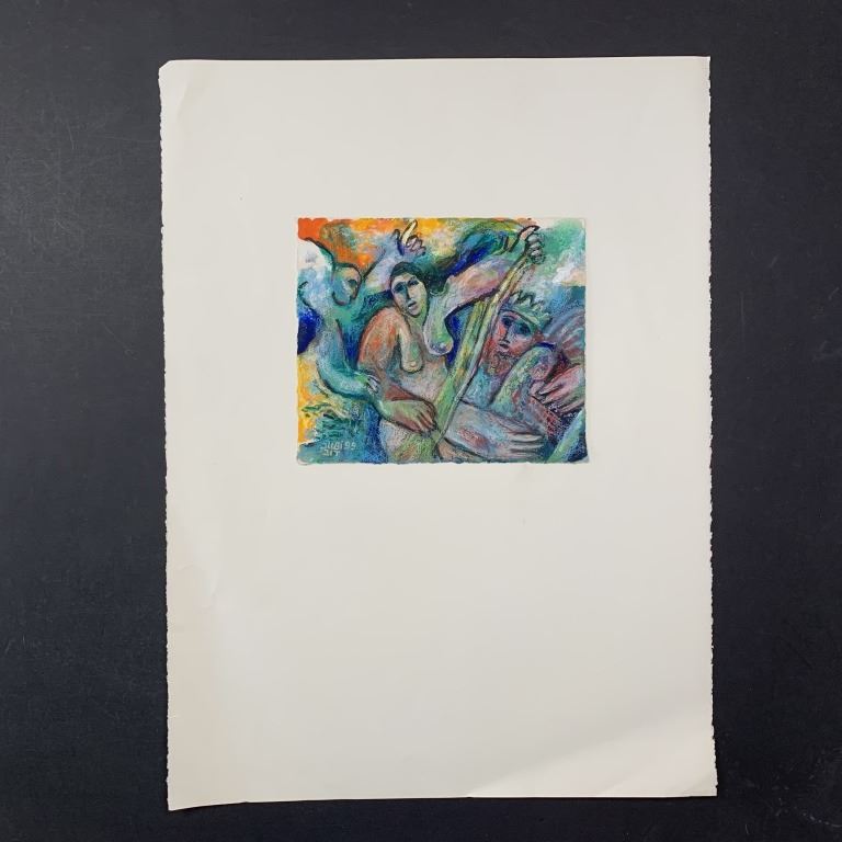 Dubie Arie's "King's Vision" original acrylic on paper, signed and dated lower left. This piece is of a nude woman, in front of a King, done in Arie's signature style. This piece is in excellent condition.