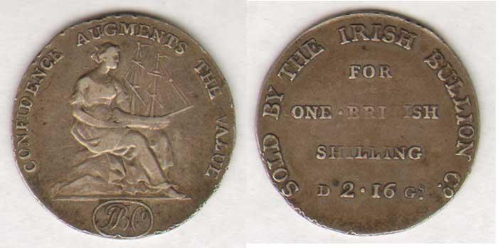 O. Seated figure holding ship right with "IBCo" in oval, below, R. "SOLD BY THE IRISH BULLIONCo", "FOR ONE BRITISH SHILLING" D2.16 Gs at centre, fine. rare.