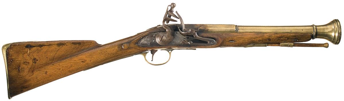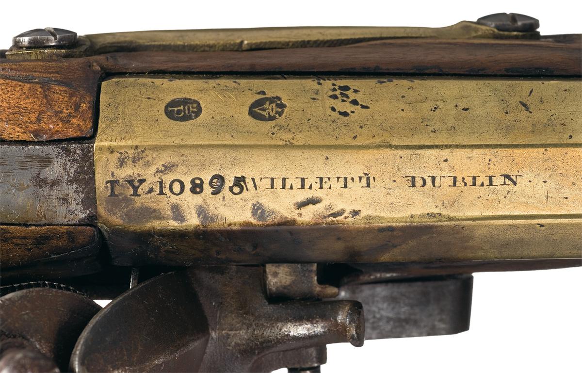 Flared cannon muzzle, with a set of "crown/ V" and "crown/ P" proofs on the left flat and "TY.10895 WILLETT DUBLIN" on the top flat. Lock is marked "TOWER" behind the hammer and "crown/ GR" ahead. Wood stock with brass tipped ramrod, brass furniture, "31" and script letters stamped opposite the lock, smooth straight wrist and a flat buttplate. Overall length is 30".