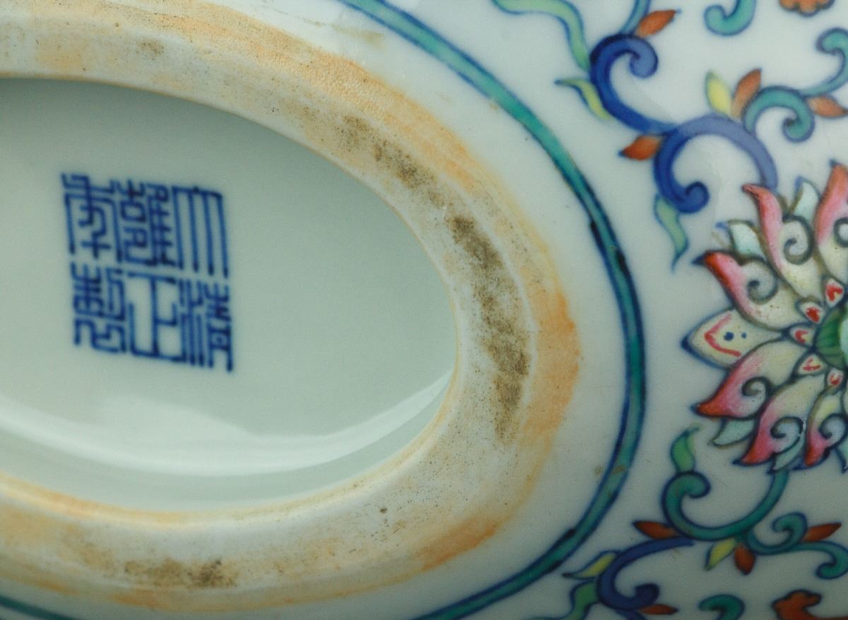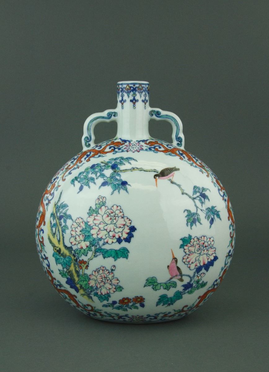 Chinese Doucai porcelain moon flask vase; of flatten globular body surmounted by a cylindrical neck and double ruyi-shaped handles; the convex body painted with birds perching on peony branches; all framed by classic chilong and lotus scrollwork; six-character Yongzheng mark on base; H: 31 cm, L: 22 cm, 3393 grams