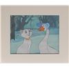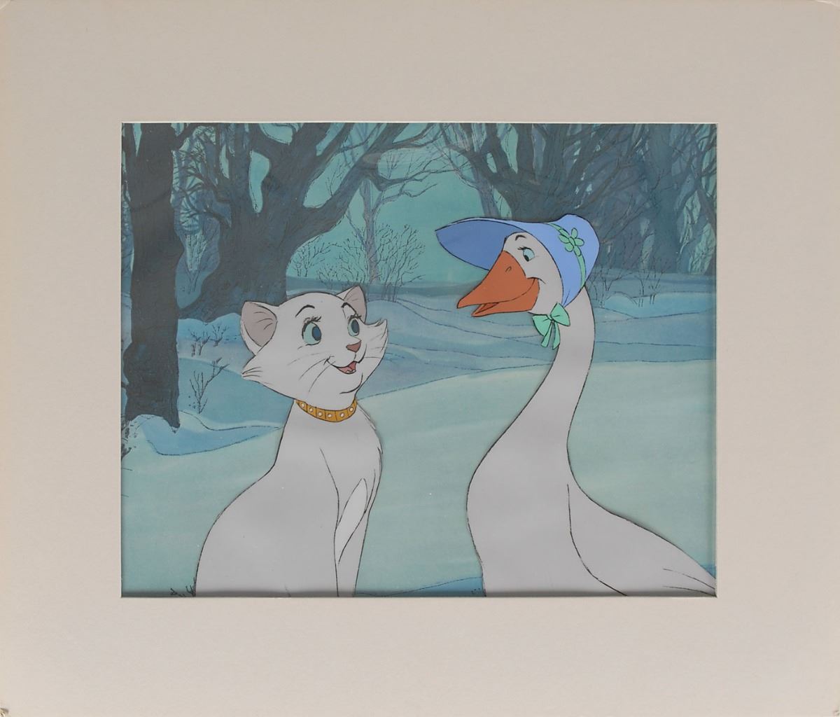 (Walt Disney Studios, 1970) Original production cel featuring Duchess and Goose from The Aristocats, showing them fondly looking at each other. The cel is placed on a Disney litho background. Images measure 3 x 5.25 and 4 x 6.25, with a mat opening of 9.75 x 8. Mat dimensions are 14 x 12. Reverse of the backing bears a gold label stating that it is an original hand-painted celluloid actually used in a Walt Disney production, and was released exclusively at Disneyland. In fine condition.