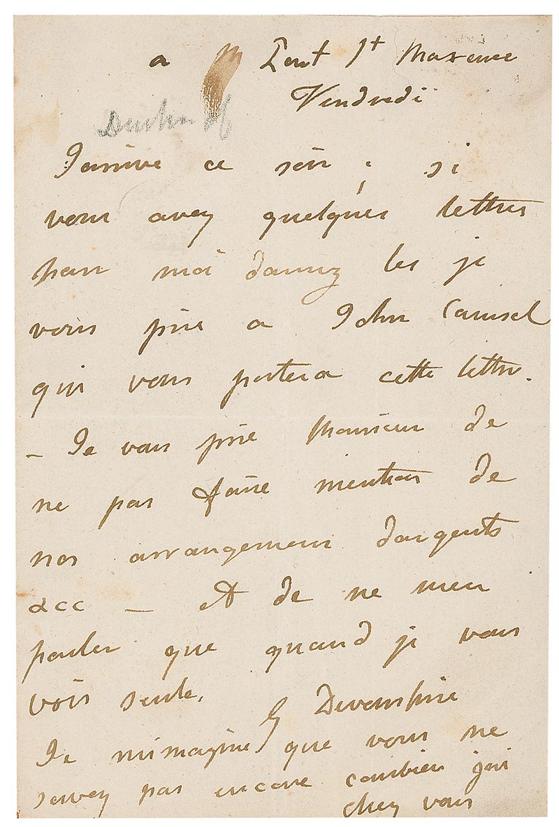 Georgiana Cavendish, Duchess of Devonshire (1757–1806), formerly Lady Georgiana Spencer, and the first wife of the 5th Duke of Devonshire. Very rare ALS in French, signed “Devonshire,” one page, 4 x 6, no date. Letter to her Parisian banker, the financier Perregaux, advising him of her imminent arrival,and asking for the letters addressed to her to be given to the bearer of her letter, John Camsel, and asking him never to mention their money business in public. In part (translated): “Please do not mention our money business to anyone, and never refer to them unless we are alone.” In very good condition, with intersecting horizontal and vertical folds, scattered soiling and staining, brushing of some ink, and a pencil notation at the top of the page. An adjoining page bears the recipient’s name, remnants of a seal, and a missing area of paper.