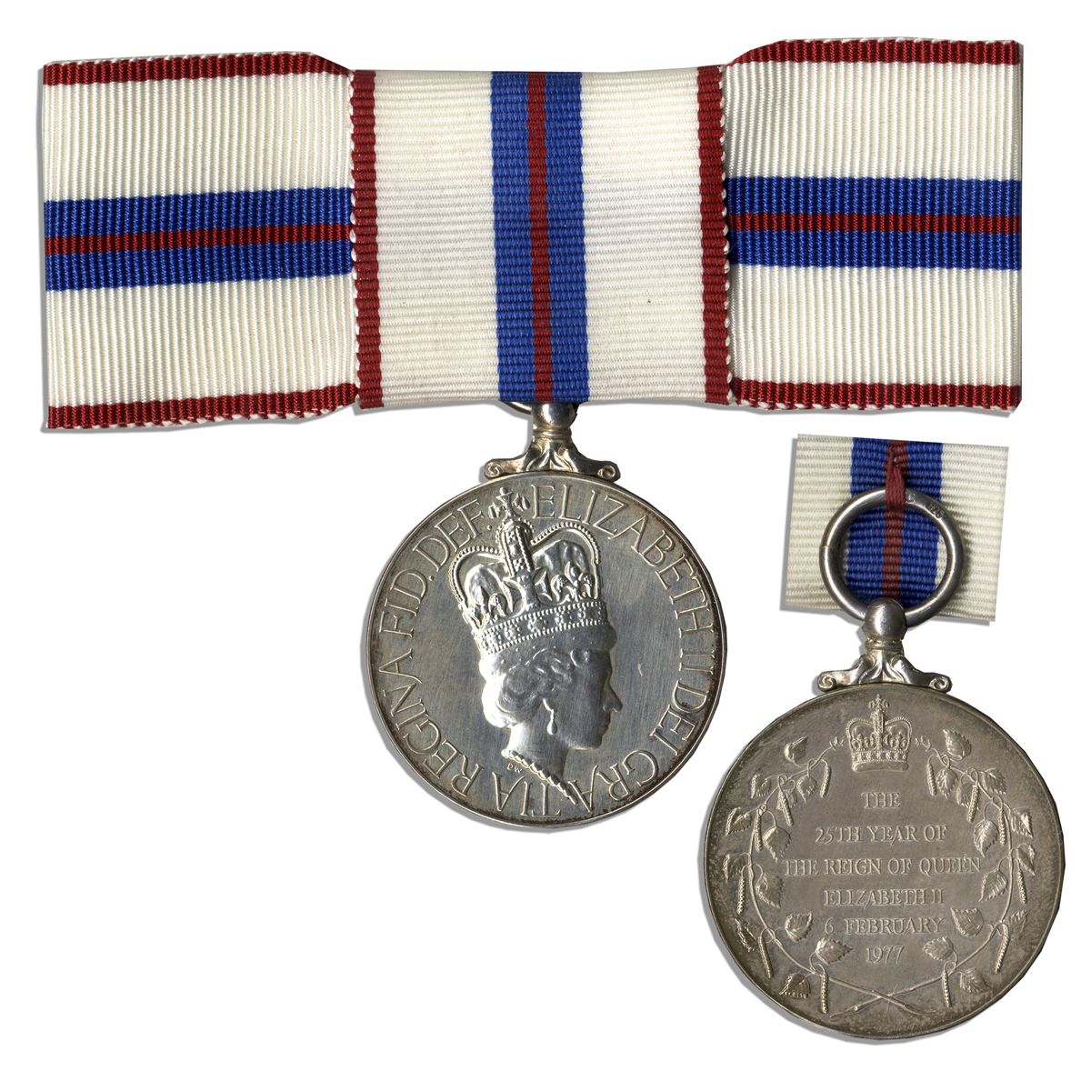 Duchess of Windsor owned silver jubilee medal. Silver medallion features a bust of Queen Elizabeth II in profile, commemorating the 25th year of her reign on 6 February 1977. Coin is mounted to a decorated loop, suspended from a white grosgrain ribbon with red and blue striping. Measures 1.25'' in diameter. Some tarnishing. Near fine overall. Housed in a fitted case with silver gilt lettering to the lid and Royal Mint stamp inside. Provenance from Sotheby's 1987.
