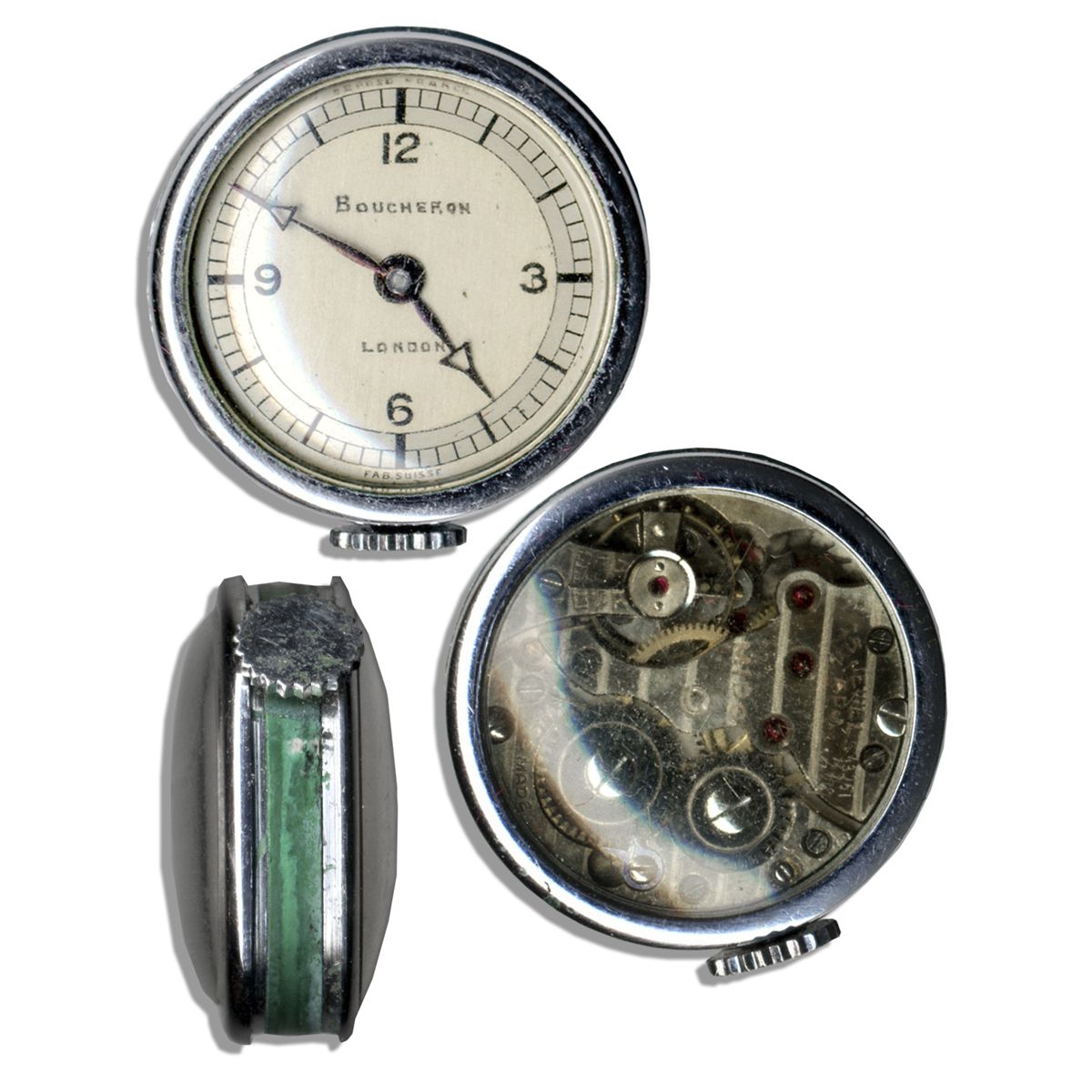 Duchess of Windsor personally owned fob watch. Luxury Boucheron London watch is encircled by an emerald green leather mount. Verso of watch has a clear face showing the mechanical parts. Measures 1'' in diameter. Very good condition. From the 1987 Sotheby's auction of The Jewels of the Duchess of Windsor, held on 3 April 1987 in Geneva, lot 249.