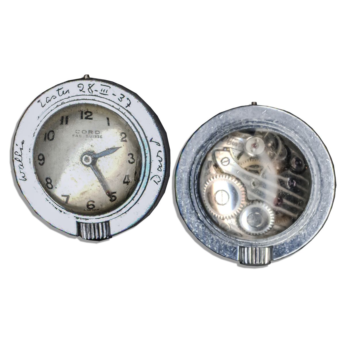 Duchess of Windsor personally owned fob watch. Luxury Swiss Cord spherical watch is inscribed on the bezel, ''Wallis Easter 28-III-37 David'' as the couple was forced to spend Easter of 1937 apart before reuniting and marrying that May, after Edward's controversial abdication from the throne. Watch face and verso both bulge creating a spherical effect. Measures 1'' in diameter. Some minor tarnishing, else very good condition. Provenance from the 1987 Sotheby's ''Jewels of the Duchess of Windsor'' auction held on 3 April 1987 in Geneva, lot 249.