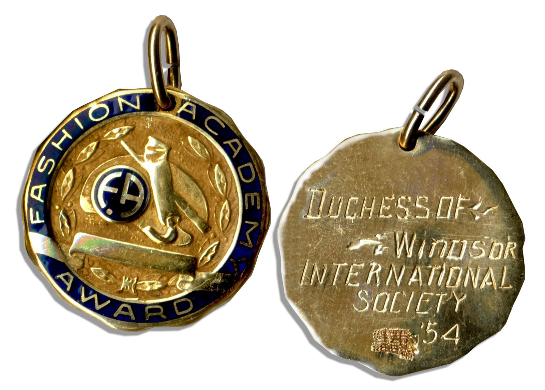 The Duchess of Windsor, Wallis Simpson personally owned and inscribed gold medallion. Circular medallion features ''Fashion Academy Award'' written in gilt to navy blue enamel border with an ''FA'' emblem to center. Verso is engraved, ''Duchess of Windsor International Society '54''. Measures .75'' in diameter with small hook to top to string to a necklace. From the 1987 Sotheby's ''Jewels of the Duchess of Windsor'' auction held on 3 April 1987 in Geneva. Light wear, else near fine.
