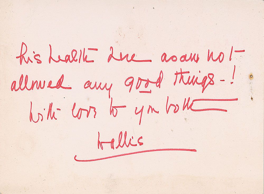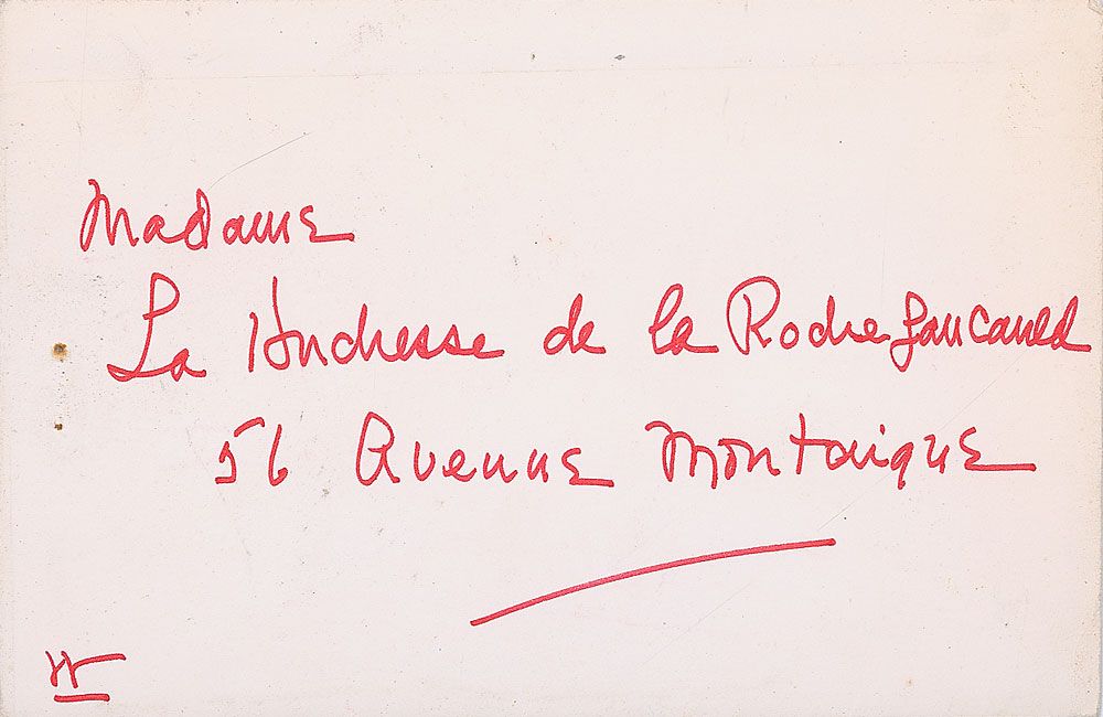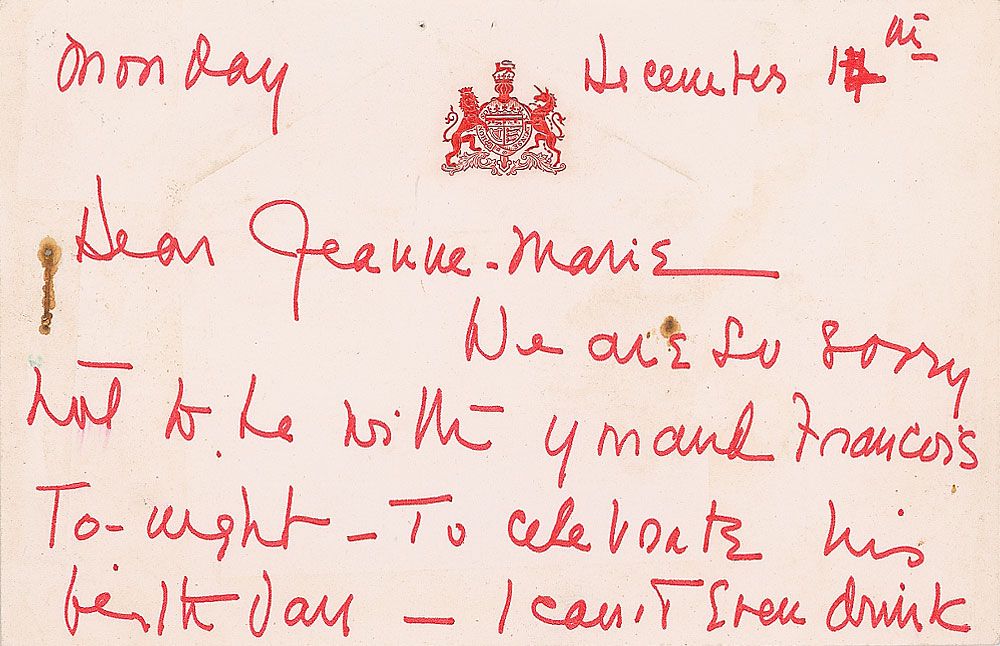 ALS signed “Wallis,” one page both sides, 6.25 x 4, embossed letterhead, December 14. Short letter to to Jeanne-Marie, Duchess of Laroche-Foulcauld. In full: “We are so sorry not to be with you and Francois to-night—To celebrate his birthday—I can’t even