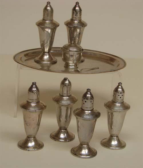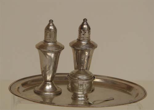 Title: Duchin Creation sterling salt and papper shakers, sugar dish and platter