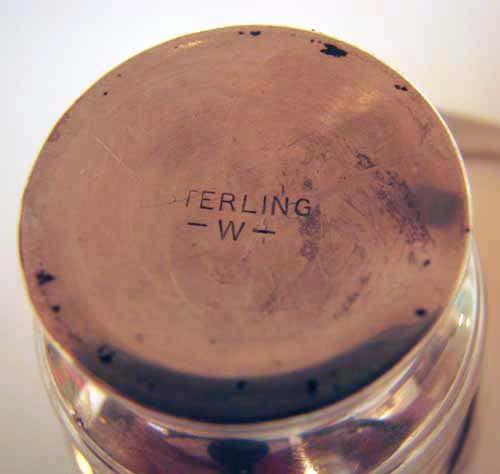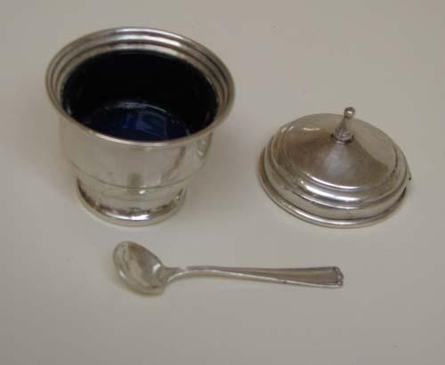 Condition: In generally fair contion apart from normal wear and tarnish, dents in top of the salt and pepper shakers and missin piece in glass cobalt liner of sugar dish
