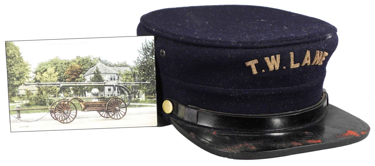 Duck Bill Wool Dress Firemen's Cap embroidered T.W. Lane and postcard with Promotional lithograph of the Thomas W. Lane Pumper.