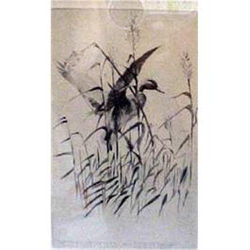 Christmas Card etching by Dick Bishop of a duck rising from marsh grass. Image size 6 inches X 3 3/4 inches. Mounted under glass and framed. Frame size 12 1/2 inches X 9 1/2 inches.<p>Richard Bishop (1887-1975), a Philadelphian, was originally trained as an engineer. His first etching was published in 1920 using an old wedding invitation copper plate. Bishop, a consummate artist, did his own sketching, etching, and printing. He also mastered the difficult technique of aquatinting. In 1936, Bishop's image "Canada Geese" was honored by being selected for the 1936-37 Duck Stamp. This was subsequently made into the first published Duck Stamp print. Bishop specialized in bird studies.