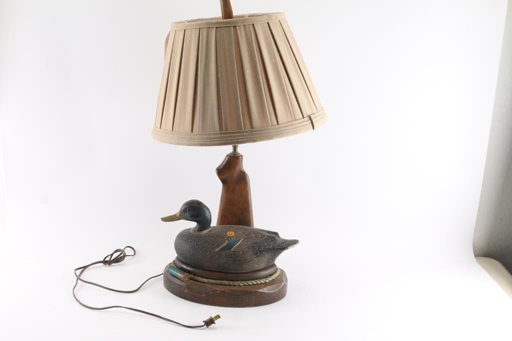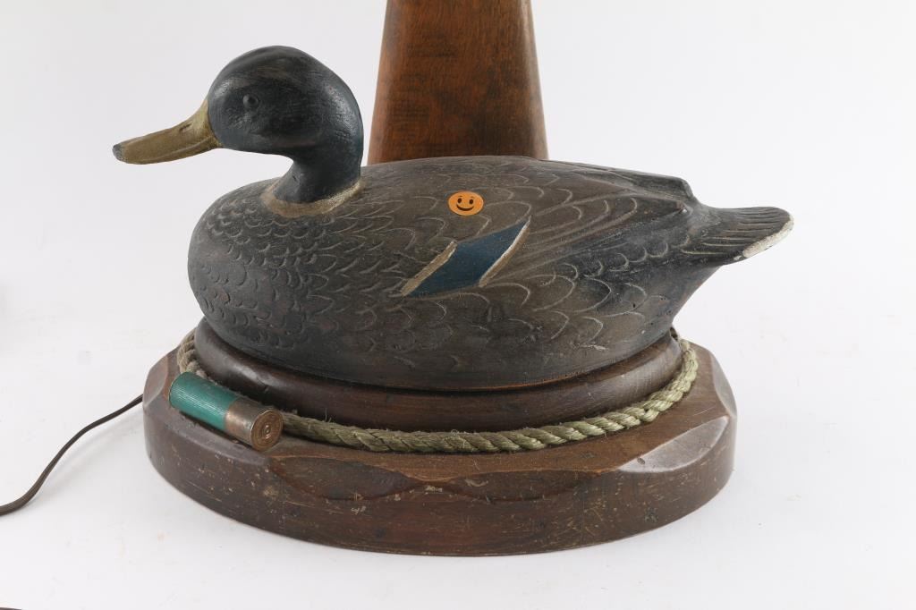 Wood duck decoy on wooden base, accented with shotgun stock and shotgun ammo. Would look great in a cabin.