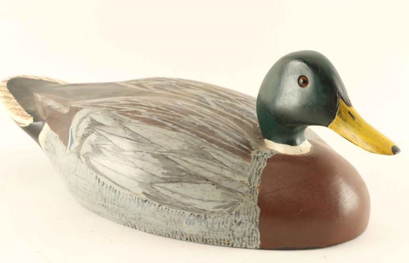 Mallard carved out of wood with 'Handpainted by LeGrand Guerry, Parleys Island, S.C.' on the bottom. Measures 14"l x 5 3/4"h x 6 1/4"w.
