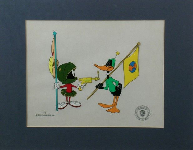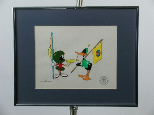 From the Warner Brothers Studios, this is a Limited Edition sericel of Marvin the Martian pointing his "A-1 Disintegration Pistol" at Duck Dodgers. This Limited Edition sericel has extra value since it is the "PP" (Printer's Proof") of 250, so noted both in the front and on the included COA from the Warner Brothers Animation Department. Sericel is 13"x10.5", and the frame is 20"x16.5".