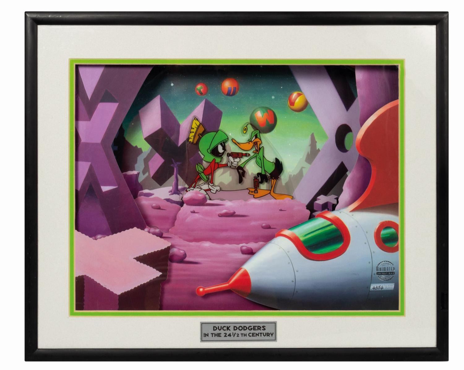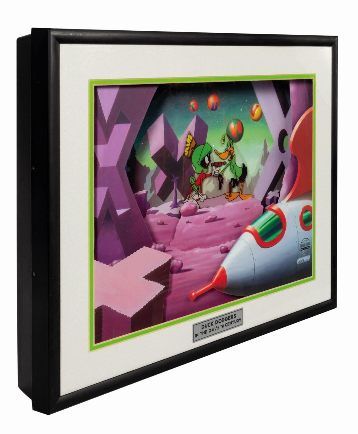 (Warner Bros., 1997) An Animated Animations electronic diorama titled "Duck Dodgers in the 24 1/2th Century." The piece recreates a scene from the 1953 animated short of the same name starring Daffy Duck as Duck Dodgers and Marvin the Martian. The figures of Daffy and Marvin are reverse printed serigraphs on die cut acetate. The scenic elements are lithographic prints. When a button is depressed on the front of the frame, the figures spring into motion, acting out a scene synchronized to the electronic soundtrack. A marvel of artistic and mechanical ingenuity, most of the Animated Animations extant today were not well kept up. Examples in working order, like this one, are exceedingly rare and highly desirable. The piece retains the Animated Animations seal on the foreground at lower right and is hand-numbered "4354/9500." It is accompanied by a Warner Bros./Animated Animations COA and care manual. Measuring 17"x21" and 2.75" deep, the piece is in very good functioning condition. The plexiglass face exhibits some minor faint scuffing.