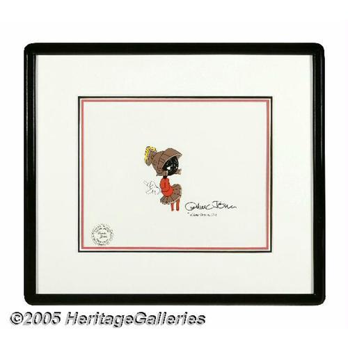 <B>Duck Dodgers and the Return of the 24 1/2 Century Production Cel (Warner Bros., 1980).</B></I> This original hand-painted production animation cel featuring Marvin the Martian appeared in the Warner Bros. short, ""Duck Dodgers and the Return of the 24 1/2 Century"". This one of a kind painting was filmed in a studio and actually appeared in the cartoon. The image area of this cel measures 14"" x 10"", and the condition is Excellent. Signed by Chuck Jones. This lot also includes a certificate of authenticity. <BR><BR><B>Important notice:</B> Heritage usually auctions material at the rate of 200-250 lots per hour. On some occasions eBay Live bid software or the Internet may not be able to keep up with the pace of the auction. We recommend placing a realistic absentee bid now as insurance to avoid disappointment. Occasionally the auctioneer may eliminate or reject an eBay Live bid, and the auctioneer may also reopen a lot after the close of the eBay live bidding (usually because we missed an audience bid), and may reject your bid even if it shows you as the winning bidder. By bidding via eBay Live, you agree that Heritage may award the lot to another bidder at its sole discretion under the circumstances described above or any other reasonable circumstances. Since eBay bids are not shown to us until we open the lot on the floor, we treat those bids just like floor bids. In most cases the floor responds before the eBay bid is presented to us, due to Internet lag time, so for consistency we have made it a policy that floor bids are always considered first over tie eBay live bids. Also please note that all Heritage lots purchased through eBay Live carry a 20% Buyer's Premium. Please make sure you read the Terms and Conditions before you bid. This lot is being auctioned in conjunction with a live floor auction by Heritage Galleries & Auctioneers. All final auction and invoice information will be supplied by Heritage Galleries & Auctioneers, and all other information shou
