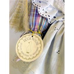 This Duck House porcelain doll has been made with the highest standards in the tradition of doll making. She is approximately 16 inches . She has long straight blond hair and deep blue eyes. She is dressed in a brown plaid dress trimmed in white lace with a matching bow in her hair. Her dress is covered with a white eyelet pinafore trimmed in lace. She has white tie shoes on her feet. She comes with her own stand and is in great condition.
